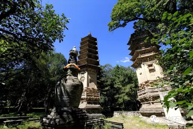 潭柘古剎,歷經了十多個朝代,規模宏大,曾有難以數計的僧人在這里修行,并終老于此,因而在寺院附近留下了數量眾多的僧人墓塔。如今在寺前的塔林內完好的保存著形式多樣的歷代佛塔七十余座。下塔院的塔林埋葬著金、元、明三代的部分高僧,塔形不一,種類較多,有石經幢式塔、方形單層浮層屠式塔、密檐式磚塔和覆缽形藏式石塔。塔林中最高大的墓塔要數金代的廣慧通理禪師塔,此塔位于下塔院的中心,塔高九層,也是密檐式實心磚塔,塔前設有寬大的石供桌,塔前左右兩側還各有一株千年娑羅樹。