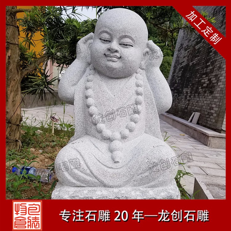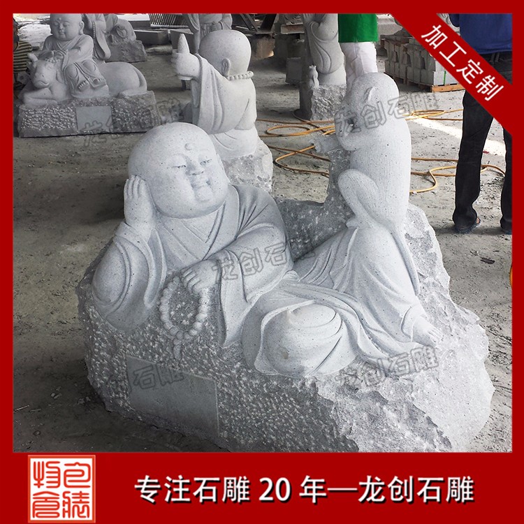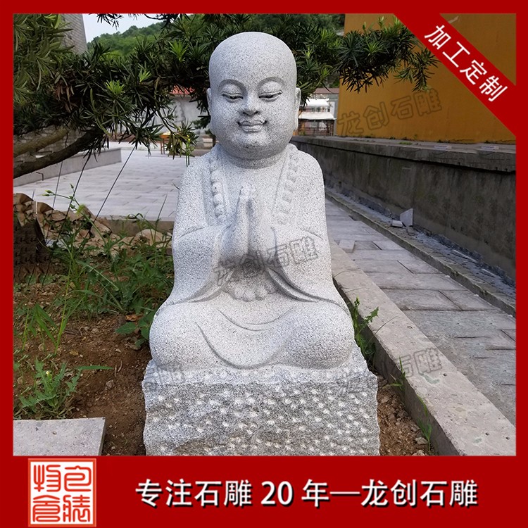石雕小沙彌是從小就進入寺院修煉佛法的孩子,俗稱小和尚。小和尚憨態可愛,在修習佛法的日常生活中,無憂無慮、懵懂、趣味的生活形態被人們以石雕的形式記錄下來,讓人們感受到小孩子的無邪與活潑。我們龍創石雕雕刻出來的石雕小沙彌可愛呆萌的形象而逗人一笑。
